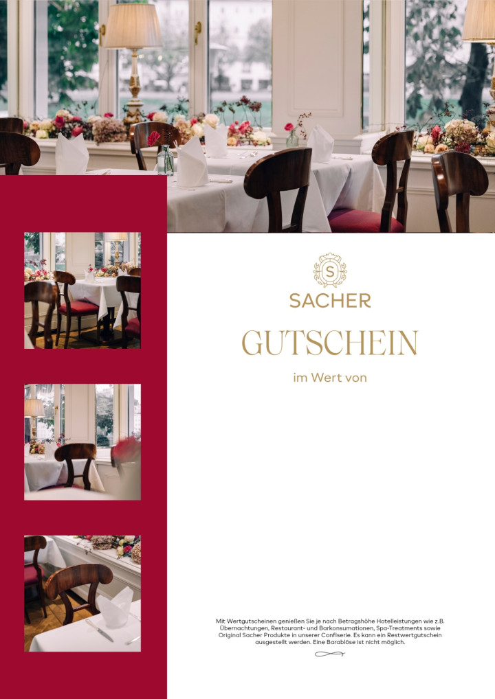 Für einen guten Morgen braucht es ein ausgezeichnetes Frühstück – dafür steht das exklusive Hotel Sacher Salzburg Frühstück Gutschein. Genießen Sie die Vielfalt ausgewählter Köstlichkeiten: von frischem Obst über feinste Eiergerichte bis hin zu frisch aufgebackenem Gebäck und genussvollen Süßspeisen. In den eleganten Räumlichkeiten des Hotel Sacher in Salzburg starten Sie stilvoll in den Tag - ein Erlebnis, das sich ideal mit einem Frühstück Gutschein Salzburg verschenken lässt. Öffnungszeiten: Montag – Donnerstag 07:00 – 10:30, Freitag – Sonntag 07:00 – 11:00.